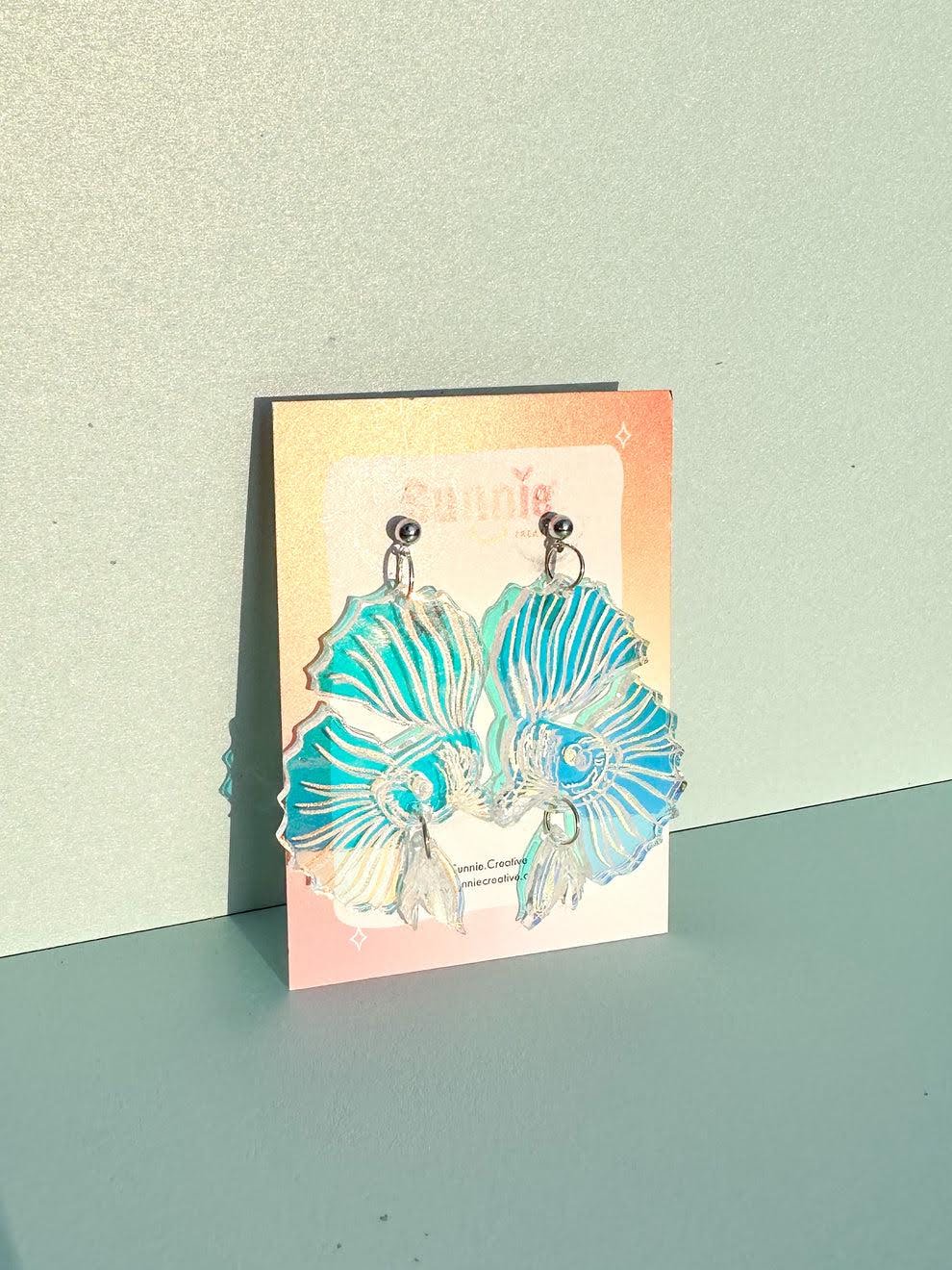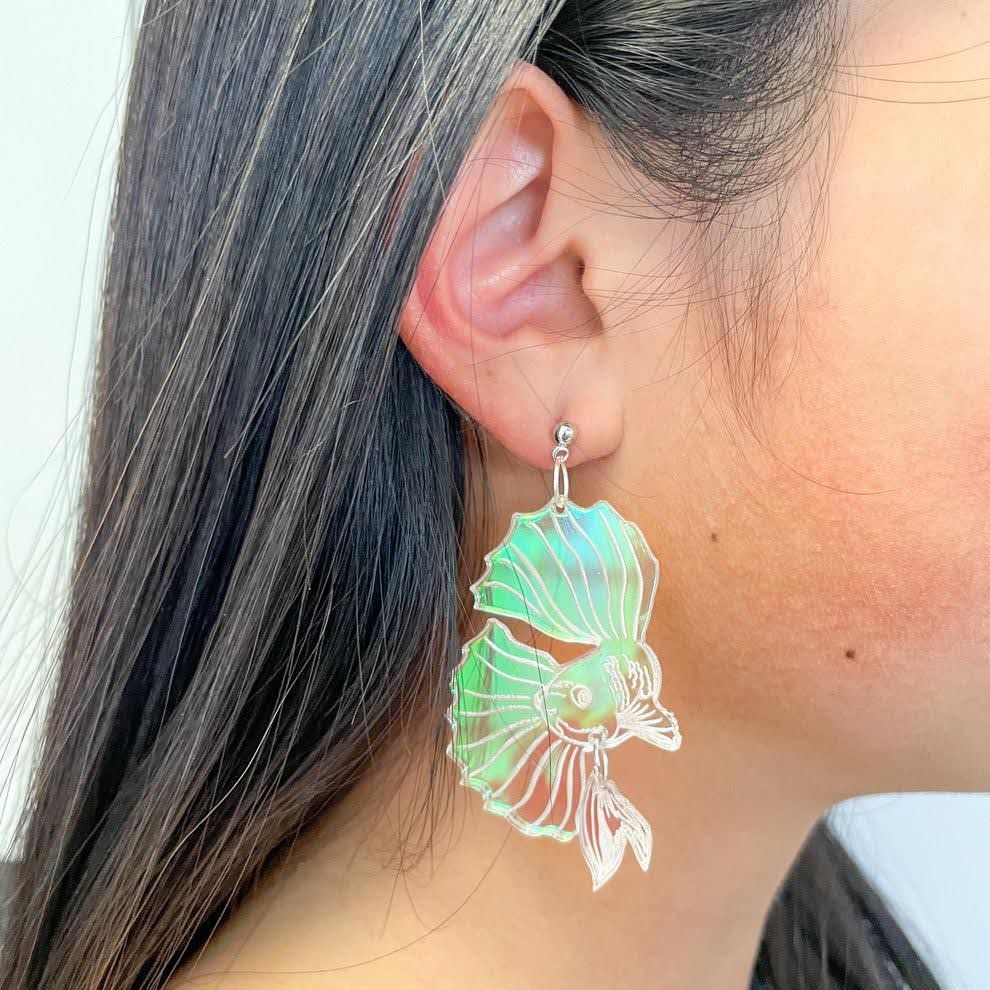 Stun in these shimmering statement earrings featuring a flowing beta fish mid-swim.